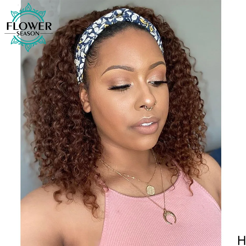 Product Name: Kıvırcık Insan Saçı Peruk Kahverengi Kıvırcık Kafa Bandı Yarım Peruk Insan Saçı Brezilyalı Makine Yapımı Peruk 150% Kısa Kıvırcık Peruk Flowerseason
